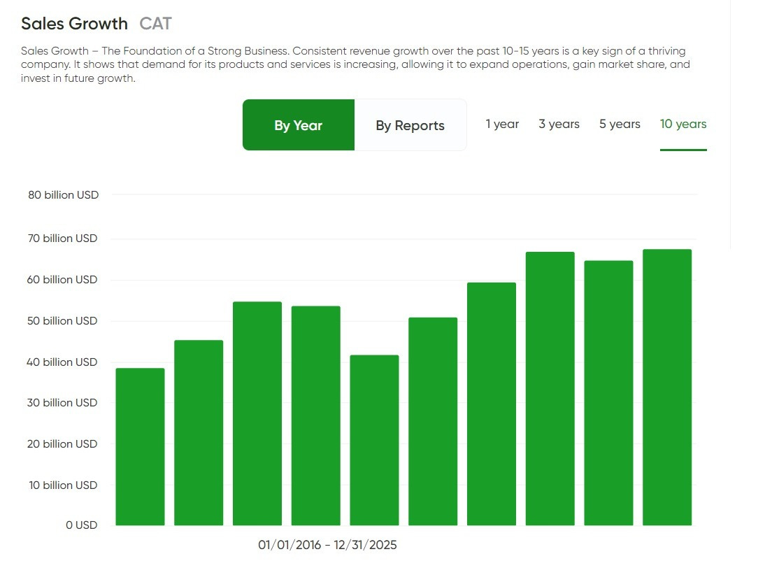 On the 10‑year view, Caterpillar’s sales grow from roughly ~$38B in the mid‑2010s to about ~$67B most recently. The path isn’t a straight line — and it shouldn’t be. CAT is tied to construction activity, mining capex, energy investment, and broader credit conditions. But the long‑term direction is clearly higher.