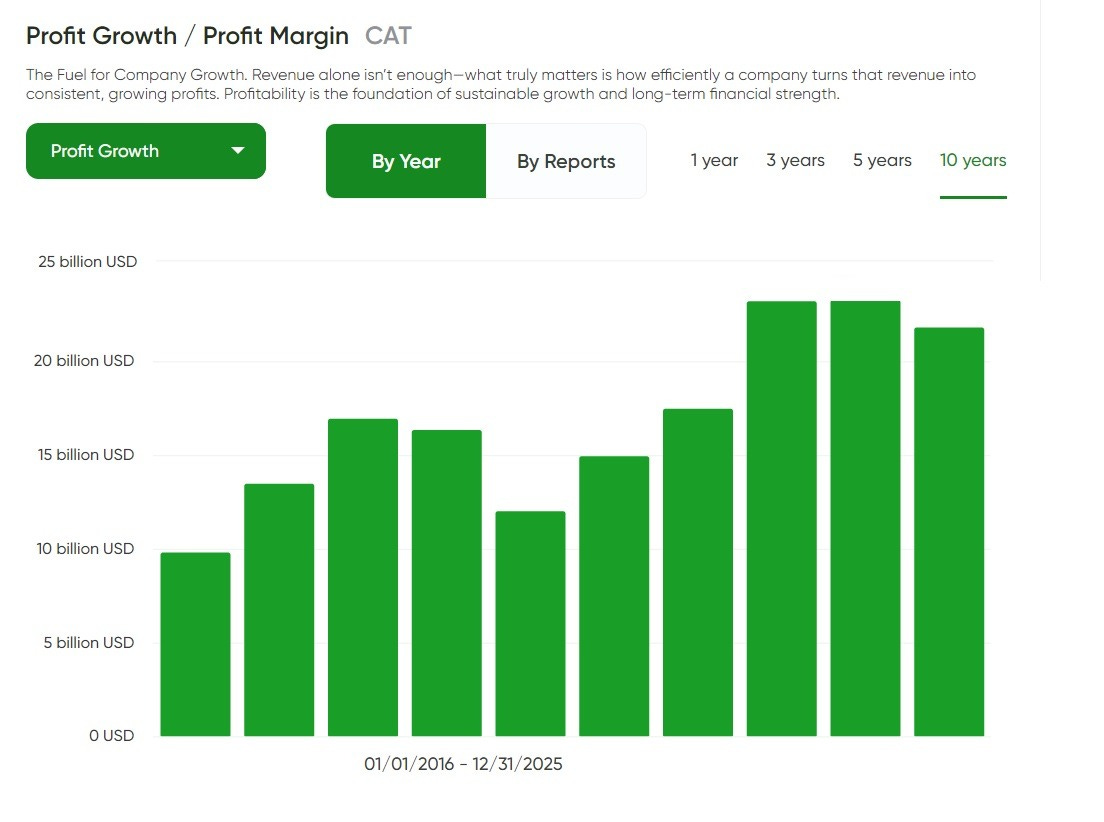 Caterpillar’s profit growth reinforces the same message as the revenue trend — but with an added layer of confidence: profitability has expanded over time in a way that looks structural, not like a one‑off peak. Over the last decade, profits rise from roughly ~$10B to the low‑$21B range most recently, with a noticeable step up after the softer middle years and continued strength into the latest period. For a cyclical industrial, that matters. It suggests Caterpillar isn’t simply benefiting from a temporary burst of demand, but operating from a higher earnings base than it did in prior parts of the cycle.