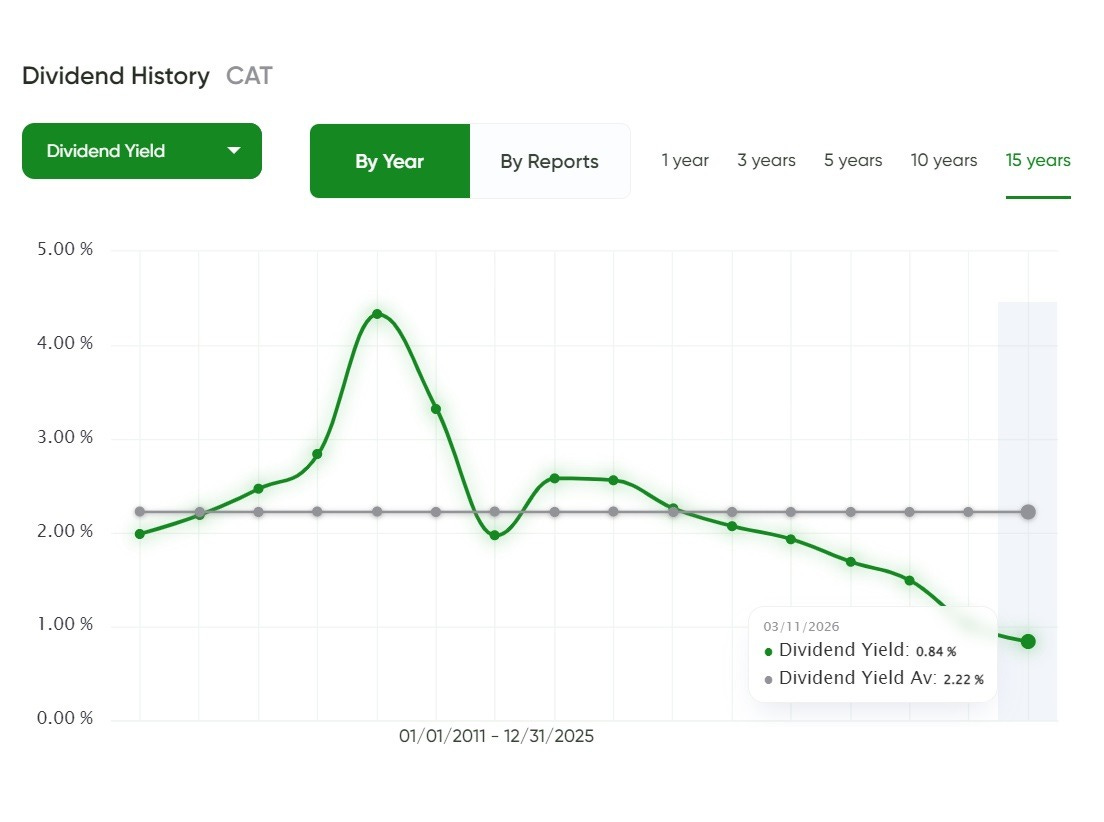Right now, Caterpillar (CAT) is yielding about 0.84%, while its long-term average yield over the 15-year view sits near 2.22%. That spread tells you the starting income today is well below what investors have typically received over this period, which usually happens when the share price has run ahead of dividend growth and the market is keeping the valuation firm.