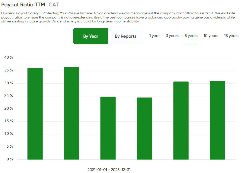 ✅ Dividend Payout Safety passed — despite a temporary distortion during an earnings shock, Caterpillar’s payout ratio has returned to a more sustainable range, supporting the view that the dividend is affordable under normal conditions and can continue compounding without cornering the balance sheet.