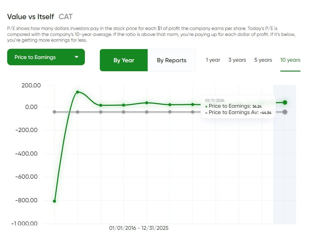 On a “value vs. itself” basis, Caterpillar (CAT) doesn’t screen as cheap versus its own history — but the comparison needs context. The current P/E is around 36.24, while the 10‑year “average” shown is around -44.54, which is a sign the average is being distorted by periods when earnings were negative (making the P/E meaningless or flipping it below zero).