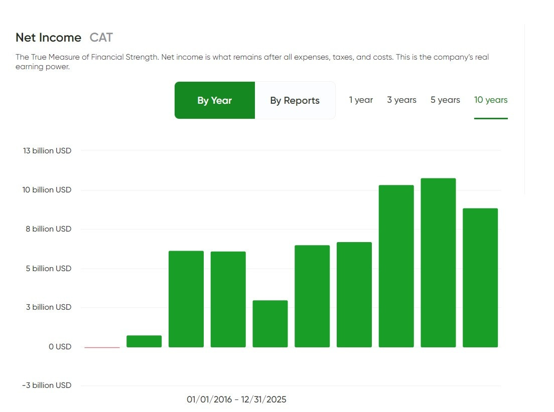 What makes Caterpillar’s record more convincing is that this is a deeply cyclical business that has still kept the dividend moving forward through periods when end markets weakened and earnings came under pressure. Earlier in the decade-long financial picture, profitability even dipped into a loss before rebounding and building to a much higher earnings base later on. Through that kind of volatility, Caterpillar maintained its dividend posture and then strengthened coverage as results recovered. That sequence matters because it demonstrates resilience in practice — not just in theory.