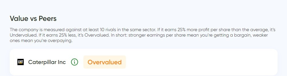 “Overvalued” doesn’t automatically mean Caterpillar is a bad company — and it doesn’t mean a crash is imminent. It means that, relative to a peer set of comparable industrial and machinery businesses, the market is assigning CAT a richer-than-average valuation for its current profit profile.
