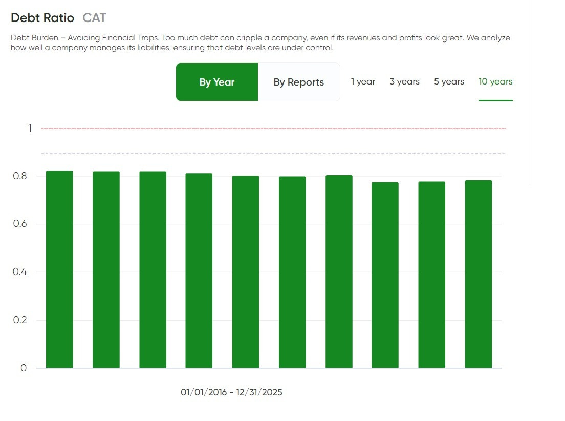 ✅ Debt burden passed — leverage is high, but Caterpillar’s pattern looks more like structural leverage supporting a capital‑intensive model, with the key positive being the overall stability of the ratio across the cycle.